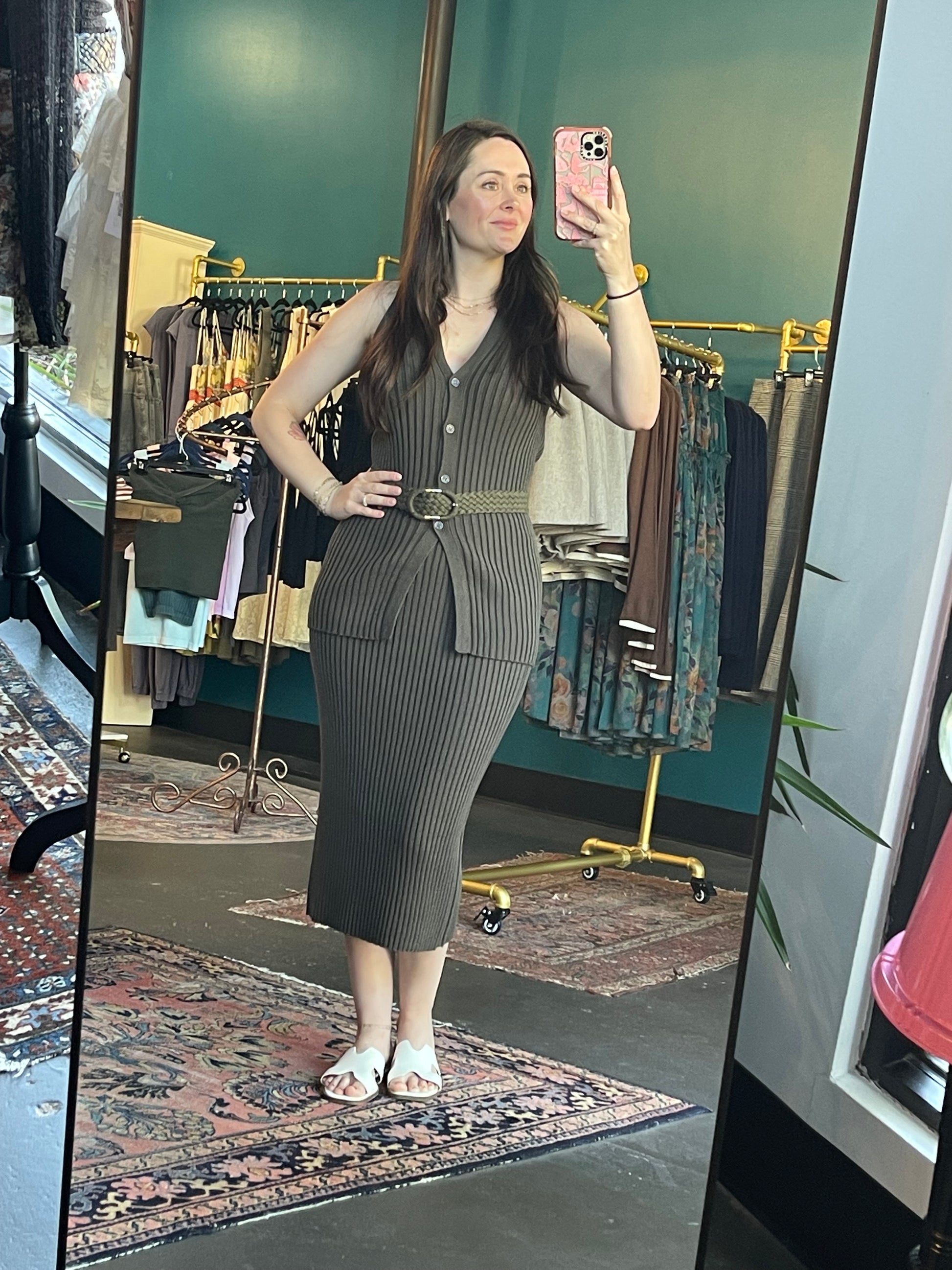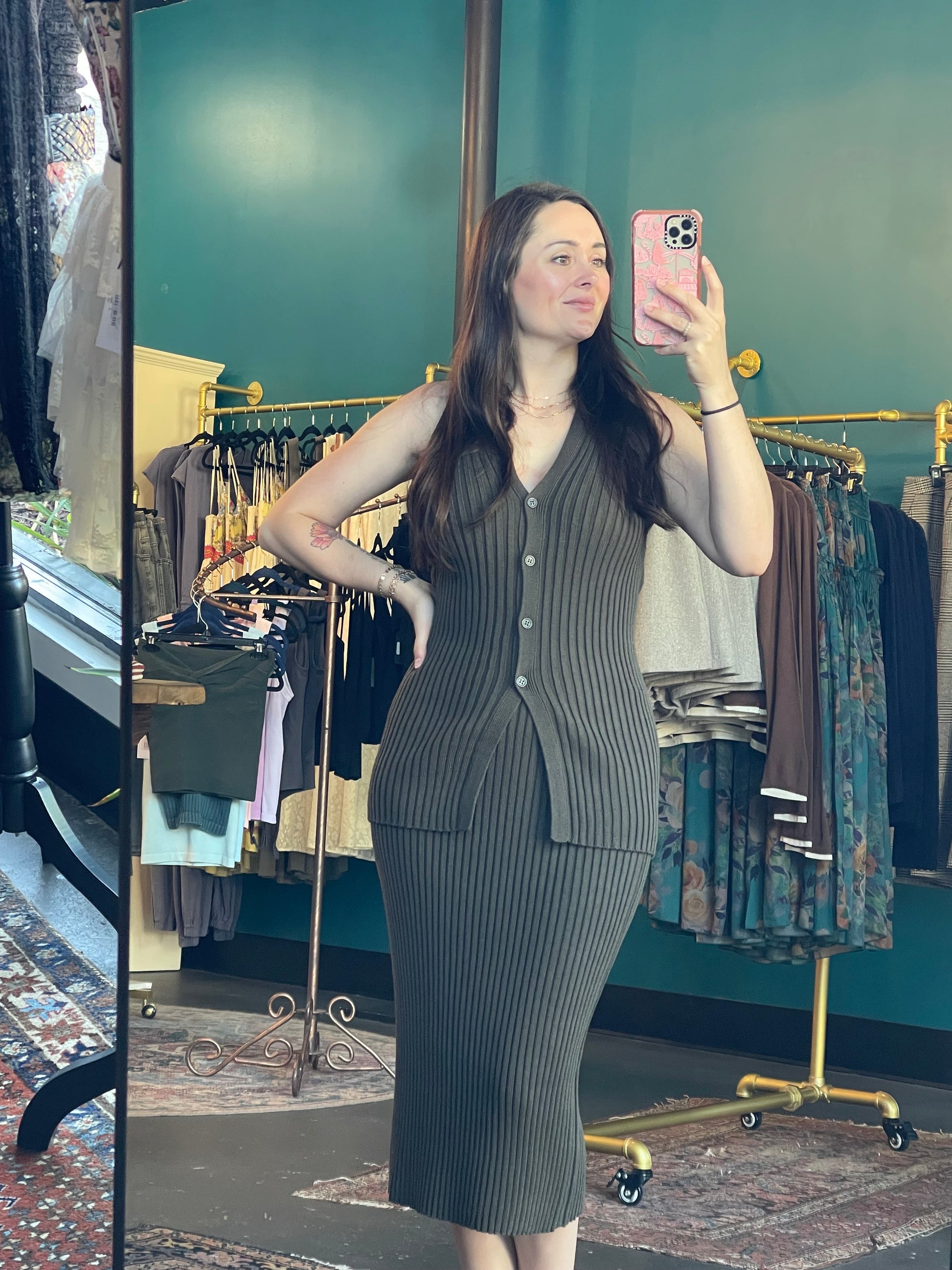 A sleek, ribbed knit vest with a button-front design and a flattering longline cut. Its tailored silhouette makes it easy to dress up or down, whether styled solo or paired with the matching skirt.