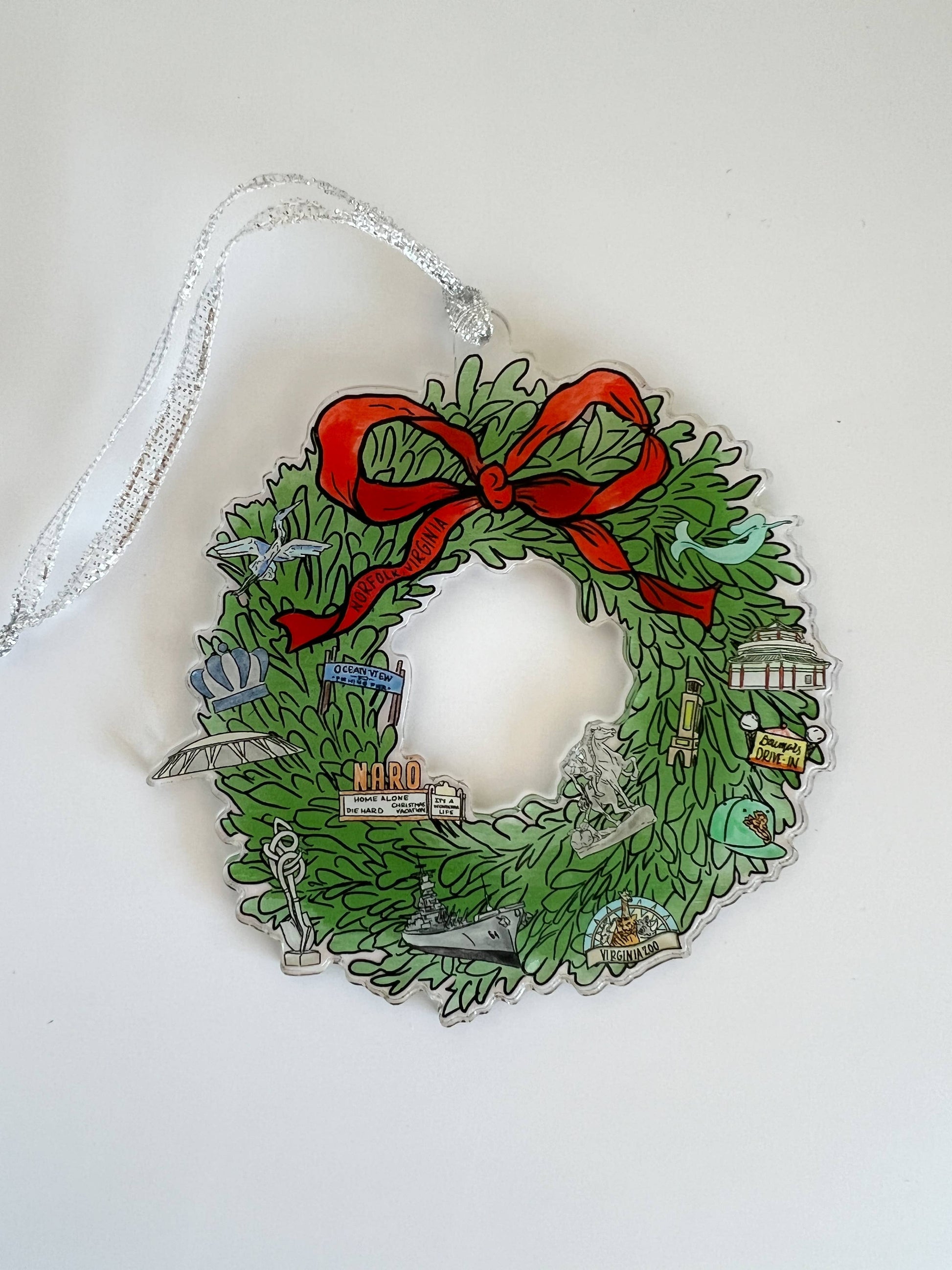 Celebrate the rich history and beauty of Norfolk, Virginia, with this one-of-a-kind 4-inch acrylic wreath ornament! Perfect for locals, visitors, or anyone who loves Norfolk, this festive ornament is shaped like a traditional wreath and features a bright red bow at the top with the wording "Norfolk, Virginia" elegantly displayed.