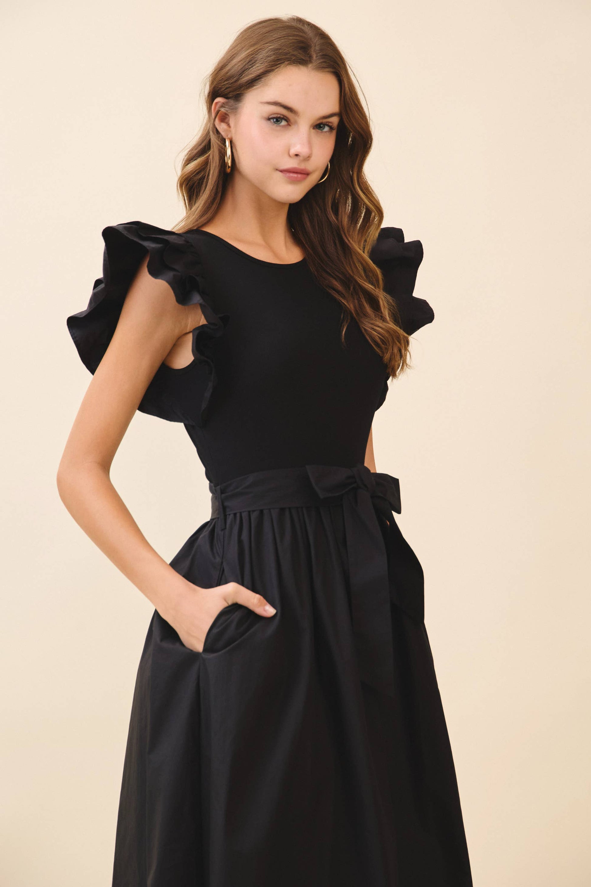 A timeless sleeveless midi dress adorned with eye-catching double ruffle shoulders for a touch of drama. The tailored bodice highlights your shape, while the voluminous A-line skirt flows effortlessly. A wide self-tie sash cinches the waist for a feminine silhouette, and hidden side pockets add a hint of everyday charm.